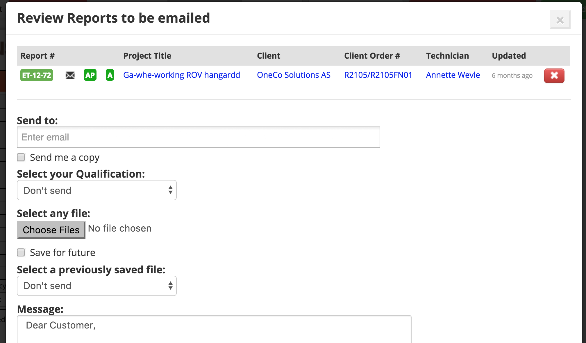 So we created an email basket system which allows users to add multiple reports and email them to multiple recipients. The email text can be customized and email recipient addresses are automatically populated depending on the client of the report selected.
